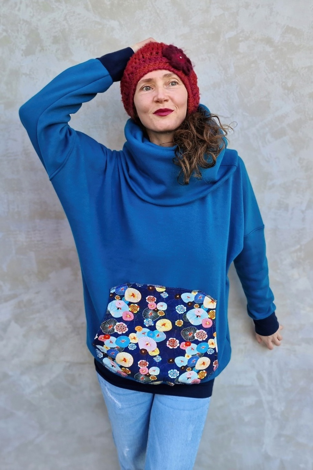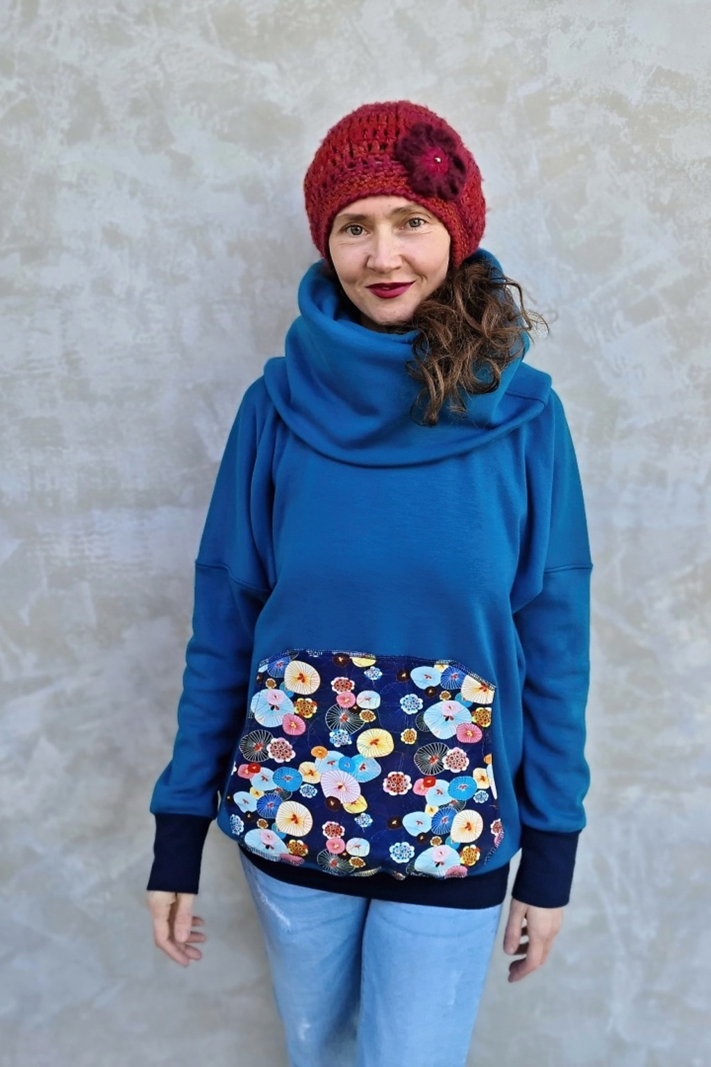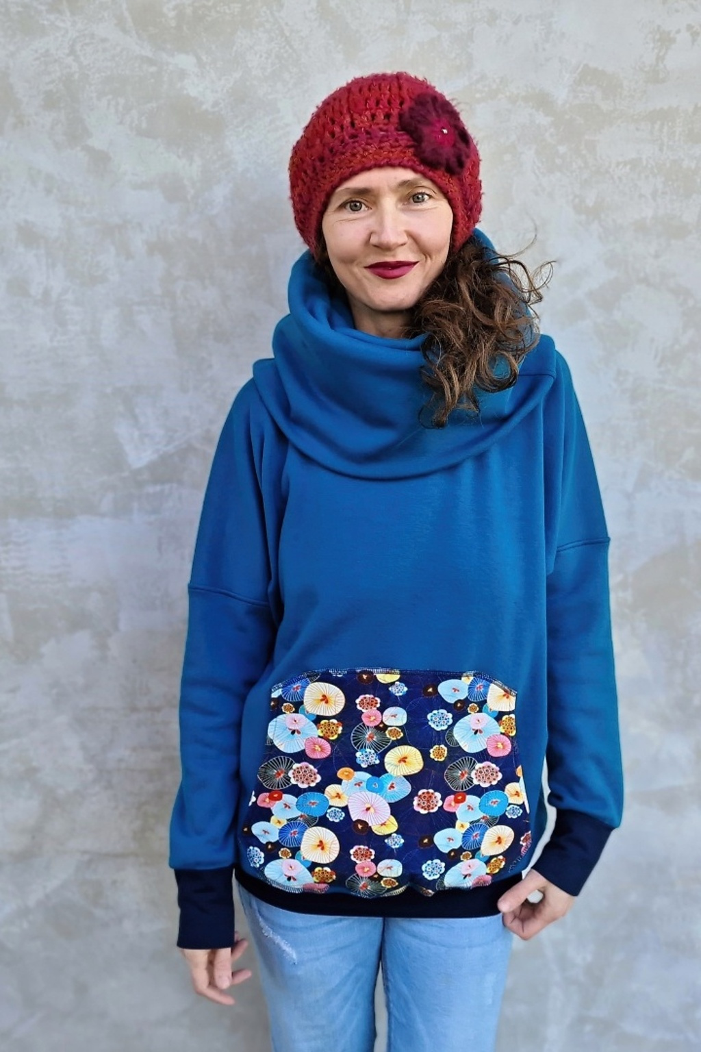 Mikinu jsem ušila z materiálu warmkeeperu - který je dokonalým společníkem na chladné dny. Vnější vrstvu tvoří odolný úplet, vnitřní strana tě bude hýčkat hebkým a hřejivým chloupkem.