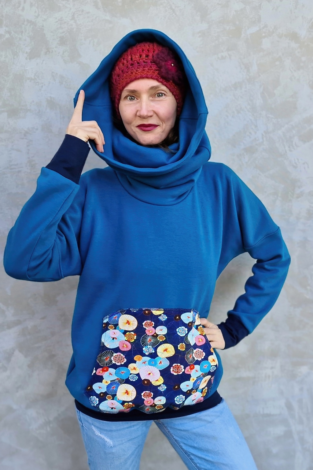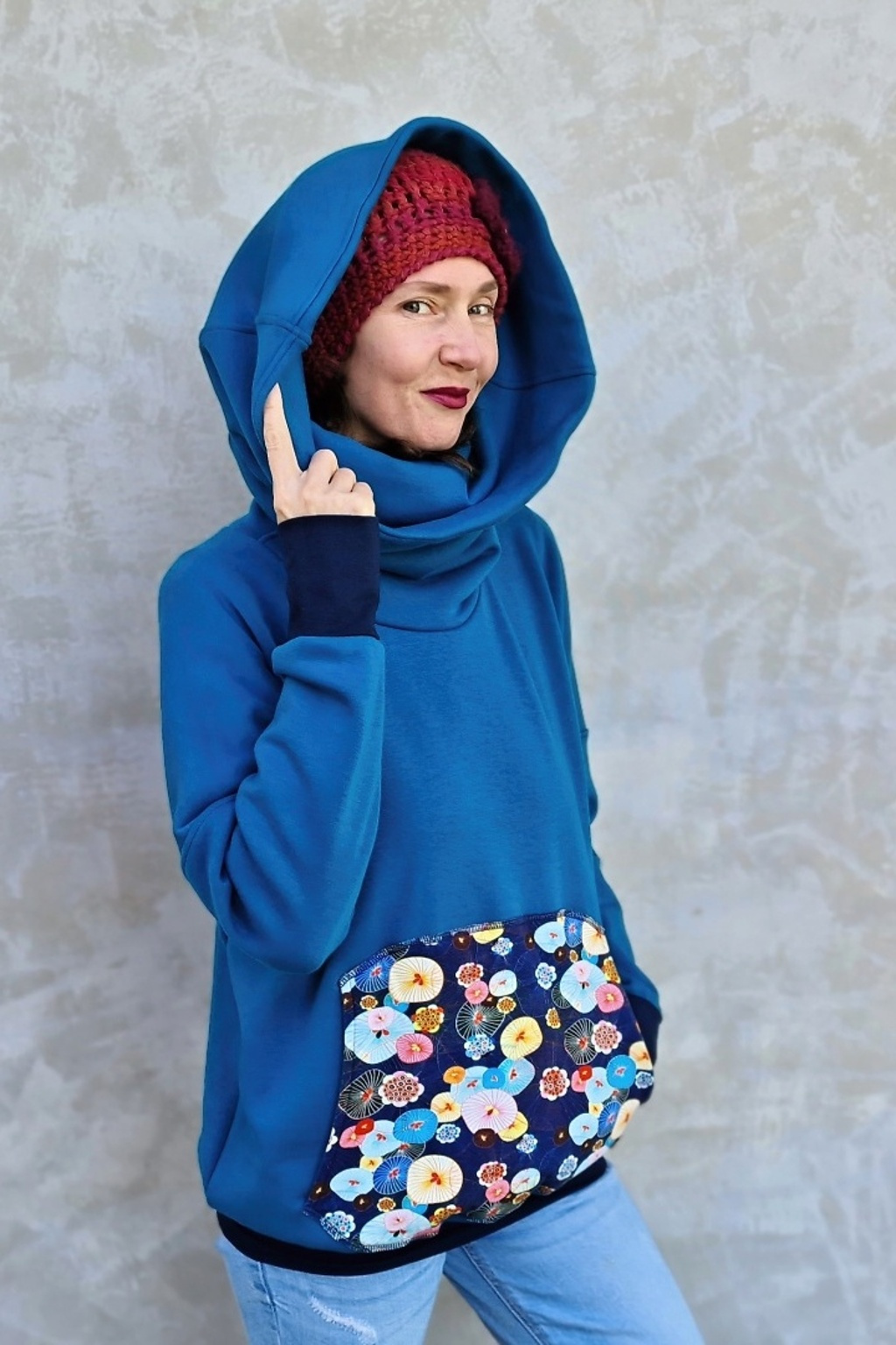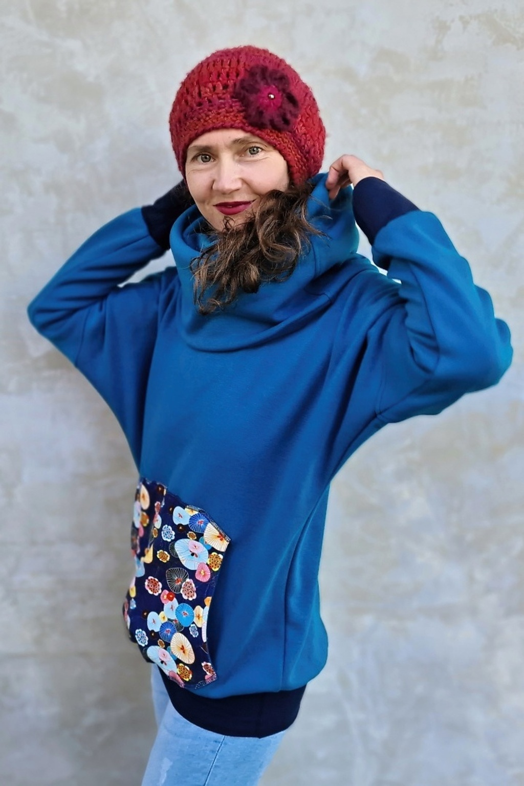 Mikinu jsem ušila z materiálu warmkeeperu - který je dokonalým společníkem na chladné dny. Vnější vrstvu tvoří odolný úplet, vnitřní strana tě bude hýčkat hebkým a hřejivým chloupkem.