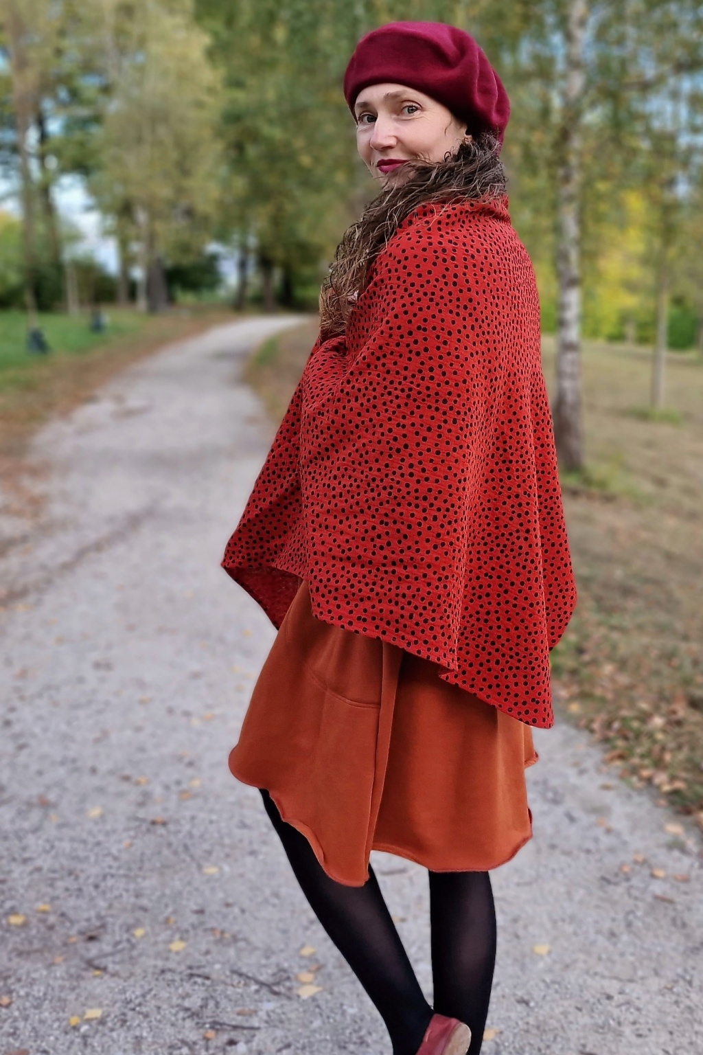 Barva: cihlovo-červená s černým puntíkem