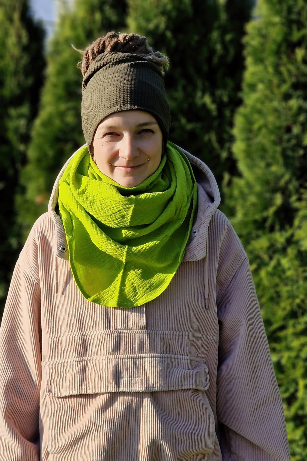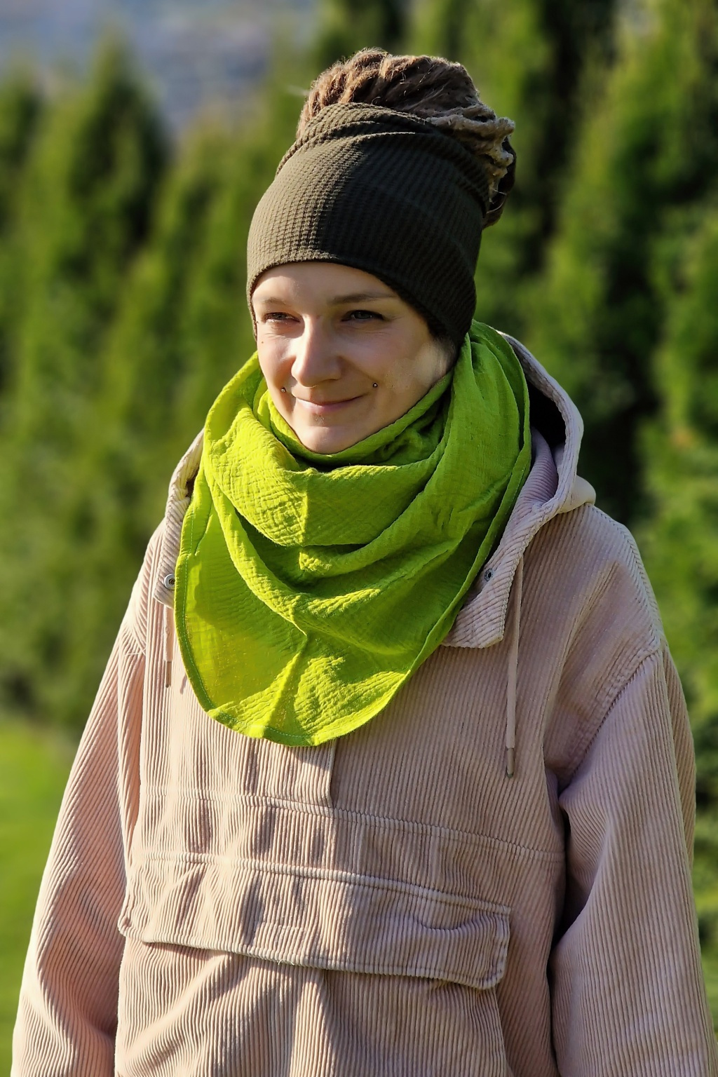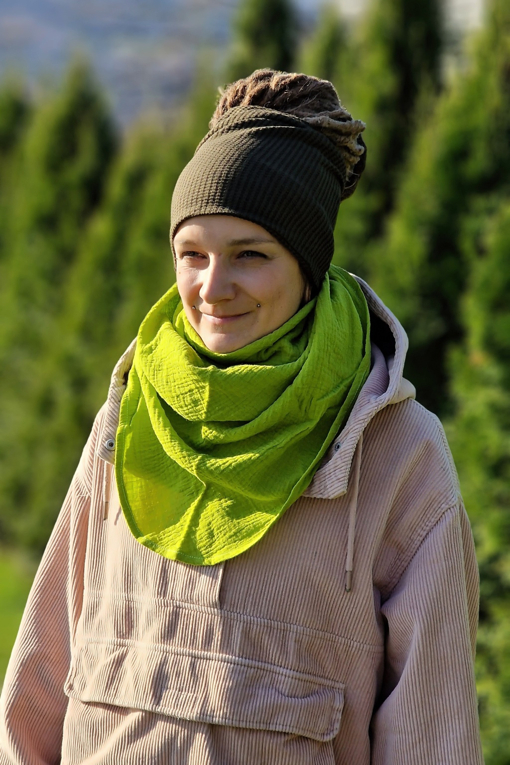 - Měkký, hřejivý a variabilní mušelínový šátek na krk!