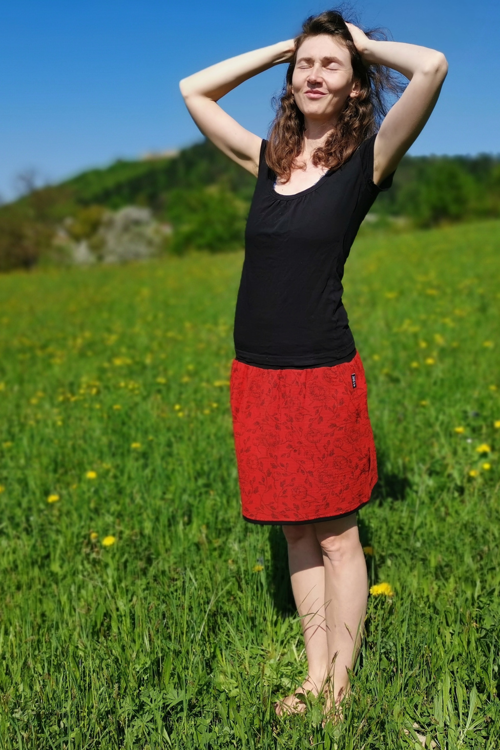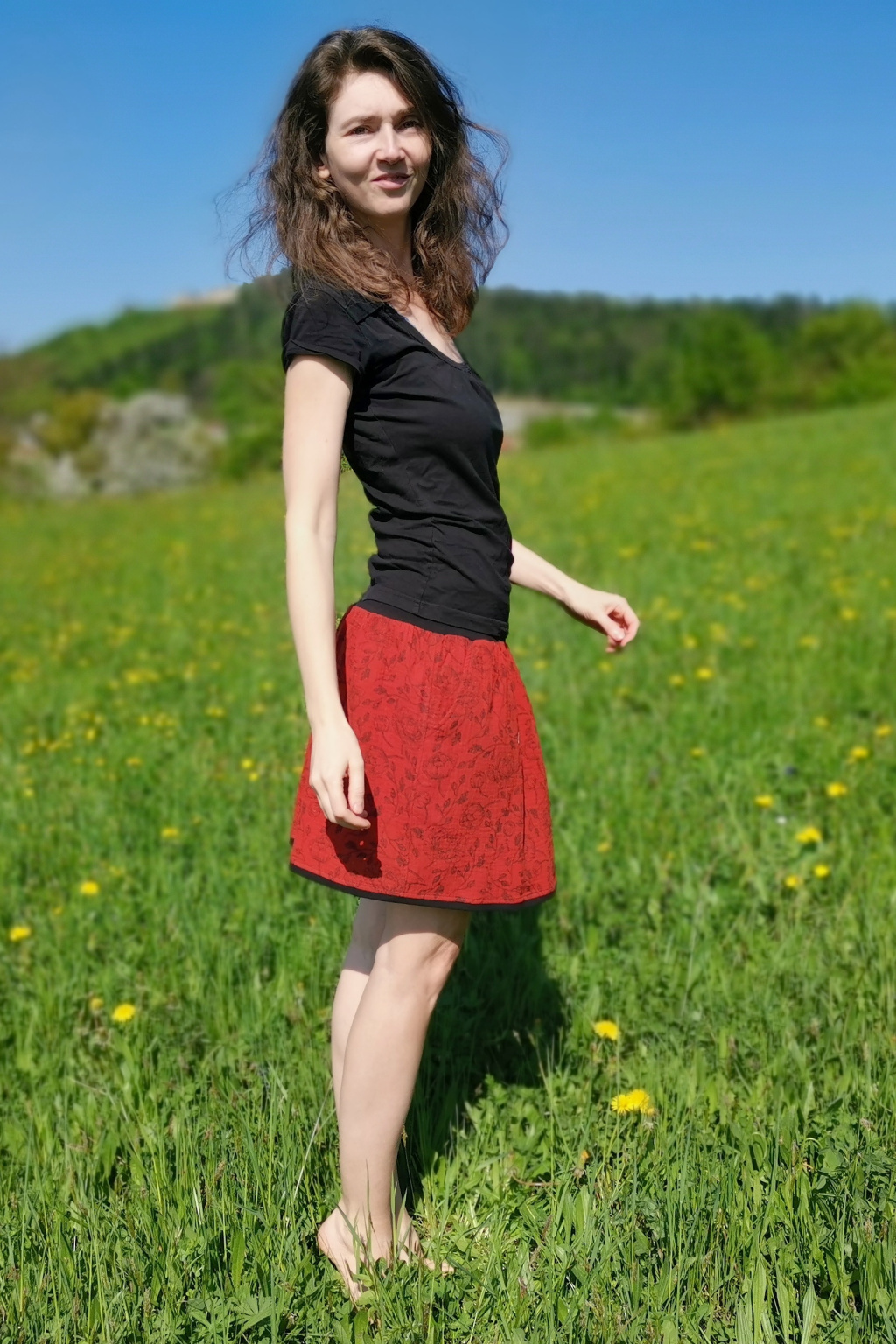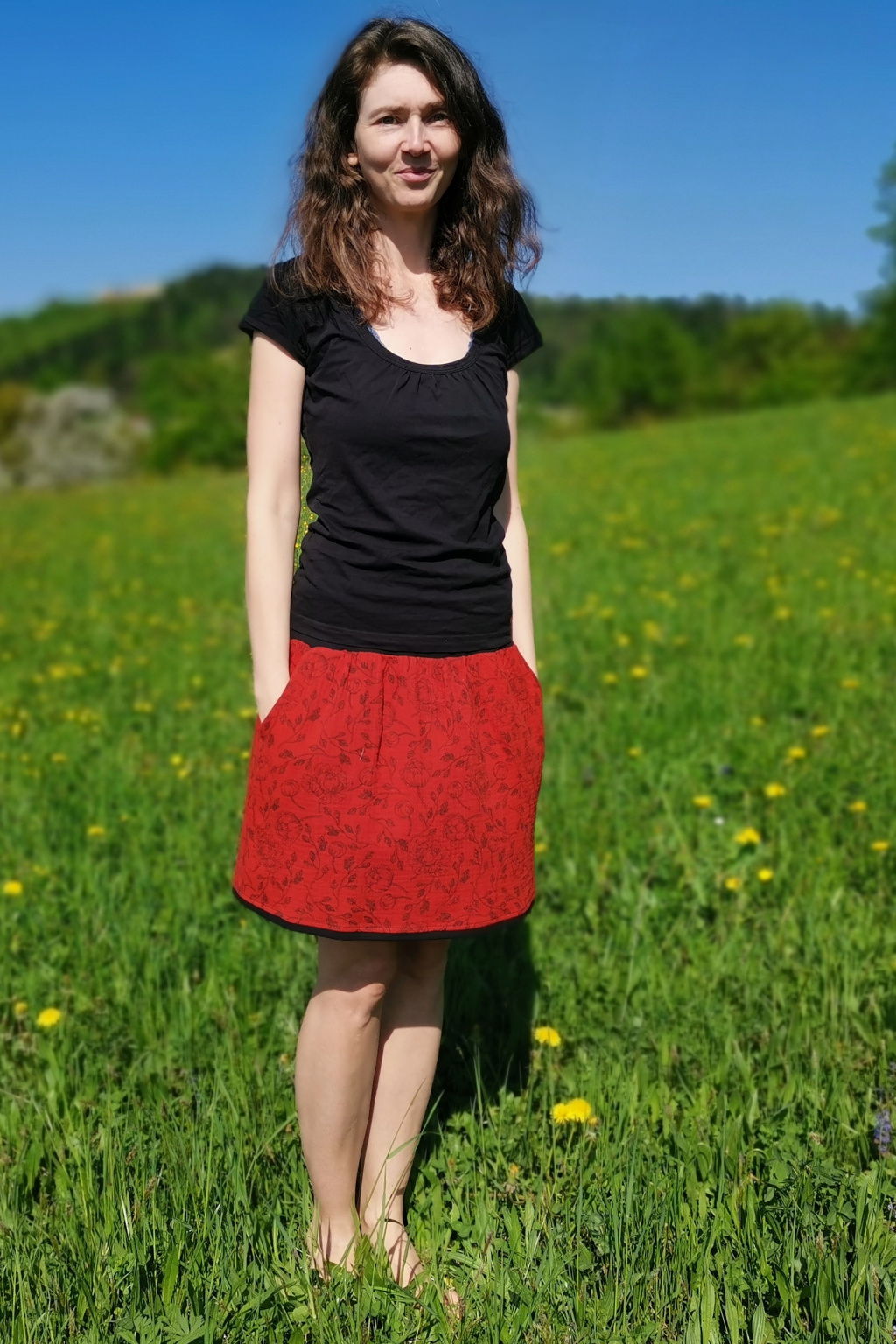 - Sukně je ušitá v jednoduchém áčkovém střihu, který sluší všem posatvám.