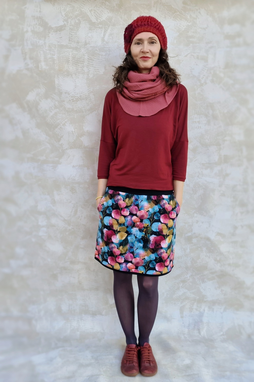 Sukně z bavlněného úpletu v áčkovém střihu.