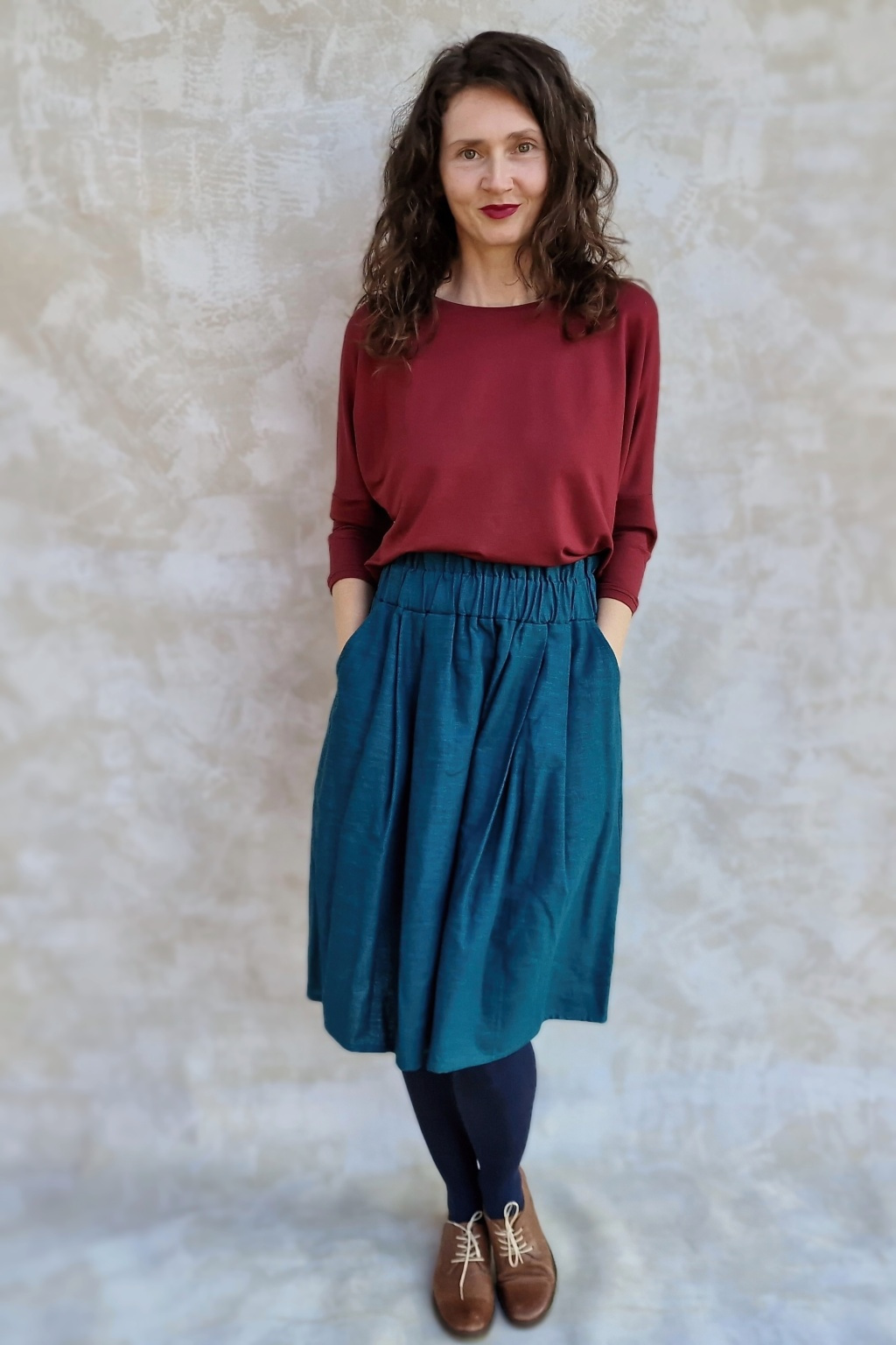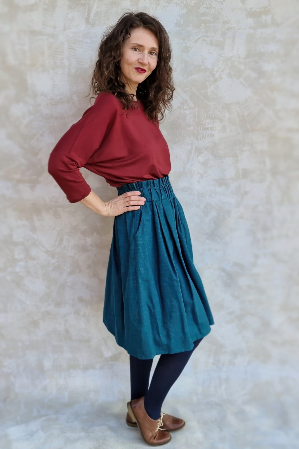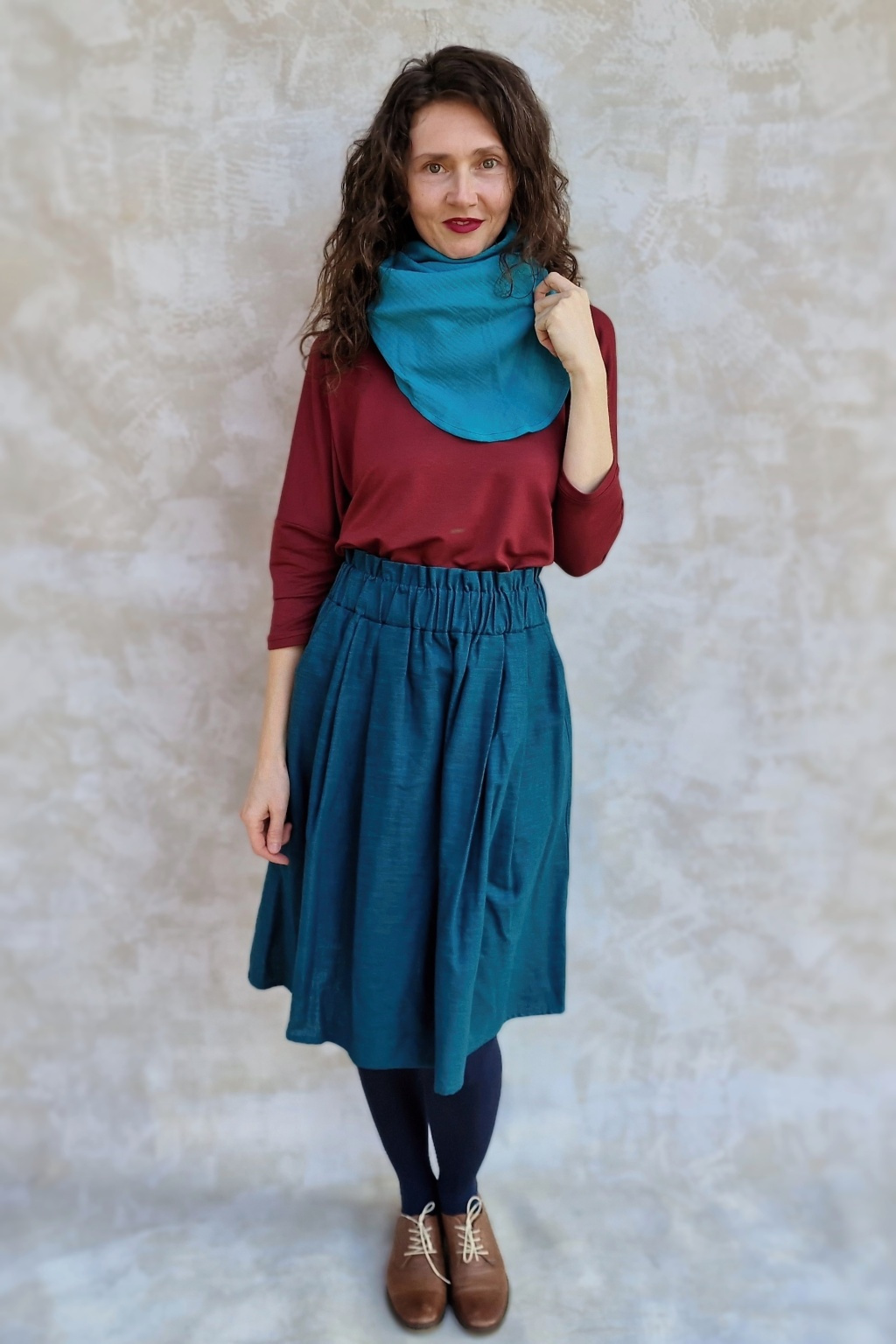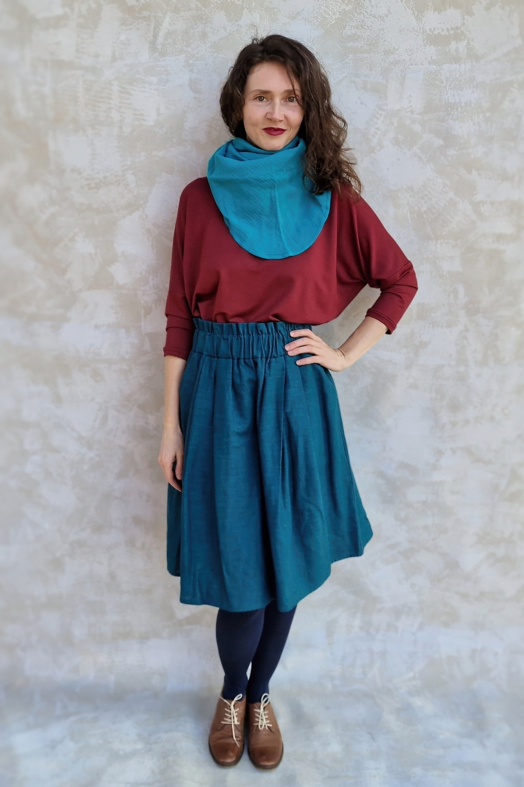 Nádherná sukně, která mě volala od první chvilky, co jsem ji viděla na webu. Není moje první, ani pátá, nejspíš už ani desátá, přestala jsem počítat, ale rozhodně ani ne poslední, co od Zuzky mám :-) Zuzka má obrovský dar kloubit krásné barvy, dokonale padnoucí střihy a následný pocit krásy a pohodlí ženské duše. Můj šatník je z většiny Sluší Ti to a je to velká radost a štěstí, že jsem narazila na někoho tak šikovného a skvělého. Doporučuju, kudy chodím, a miluju od první chvíle a první hluboké kapsy.