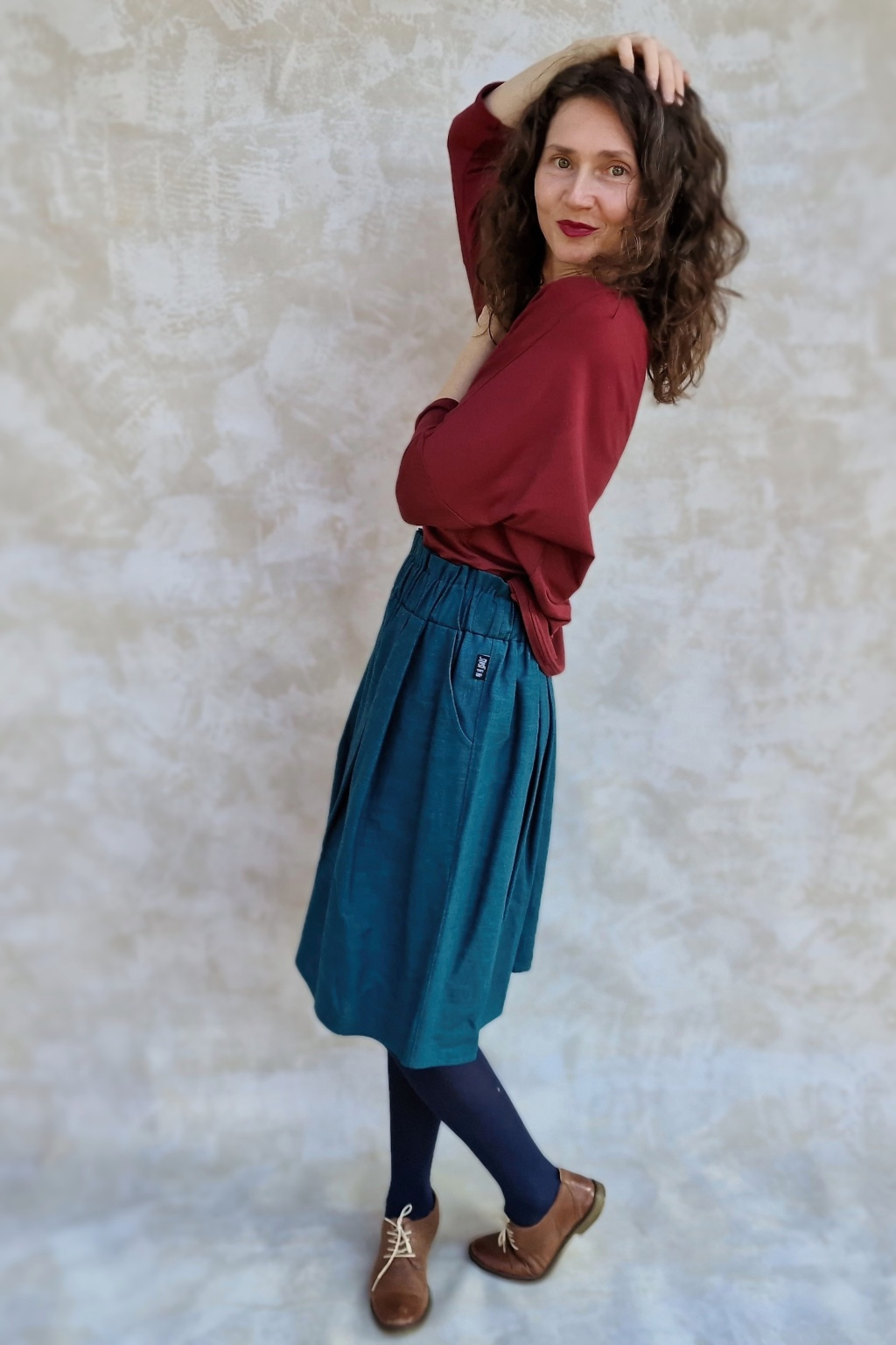 A tahle lahvově zelená lněná novinka je naživo ještě krásnější, je naprosto pohodlná, a i když jsem si myslela, že nebudu schopná nosit sukni v pase a že mi ten řasený pas úplně nesedne, tak ať sedne, nebo ne, cítím se v tom fakt hezky a líbím se sama sobě. Děkuju za každou jednu sukni a každou jednu velkou radost!